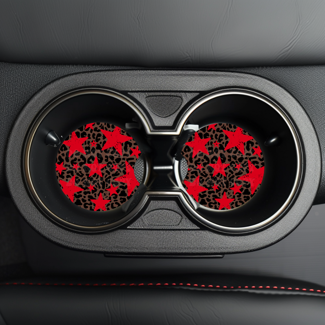 Red Stars & Leopard Car Coaster Sublimation Transfer (Set of 2)